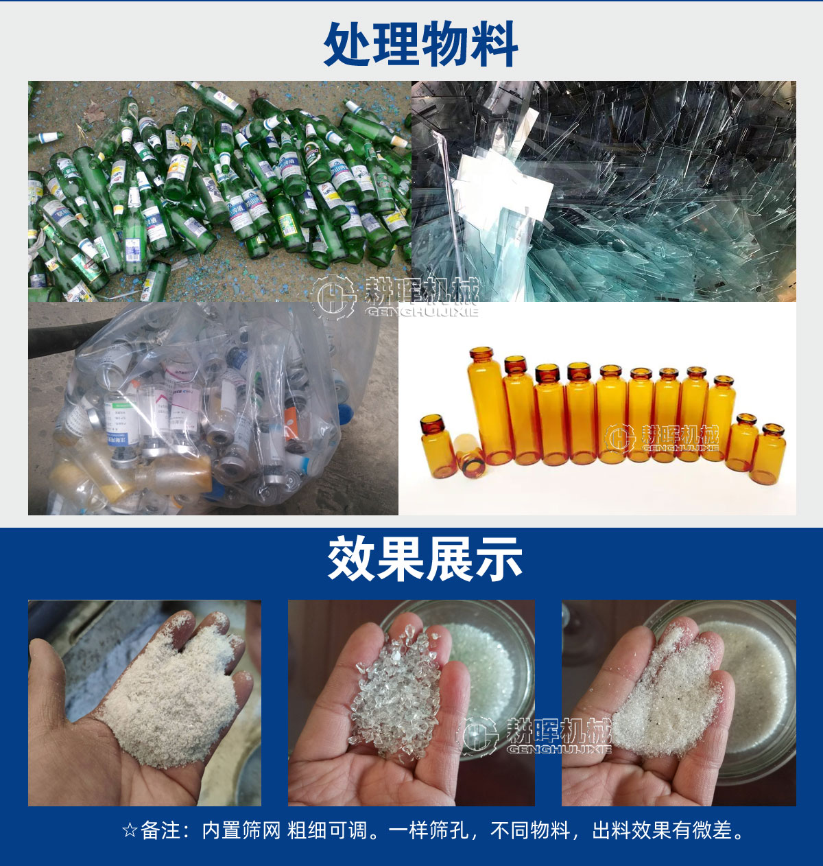 将玻璃瓶、酒瓶、钢化玻璃等玻璃制品粉碎至指定粒度。